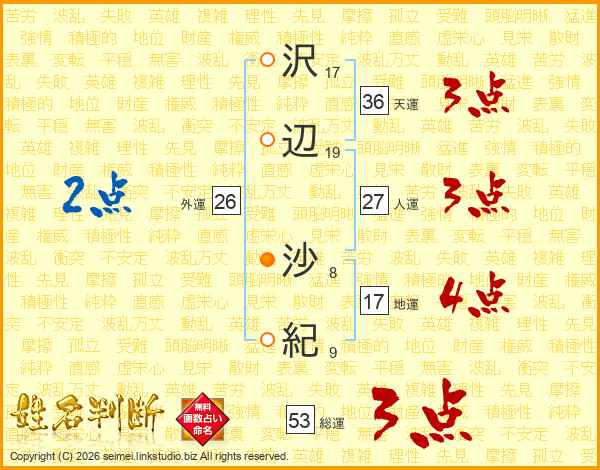 沢(17画)辺(19画) 沙(8画)紀(9画)