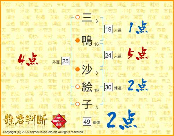 三(3画)鴨(16画) 沙(8画)絵(19画)子(3画)