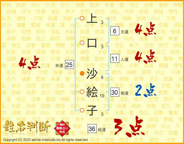 上(3画)口(3画) 沙(8画)絵(19画)子(3画)