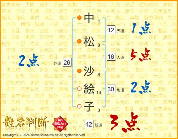 中(4画)松(8画) 沙(8画)絵(19画)子(3画)