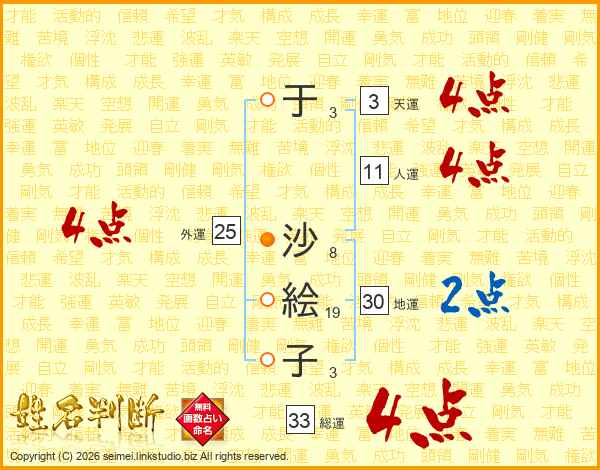 于沙絵子さんの総運は33画の4点!
