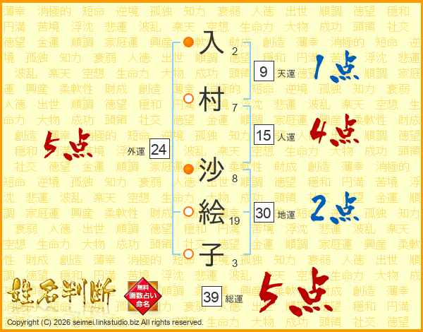 入(2画)村(7画) 沙(8画)絵(19画)子(3画)