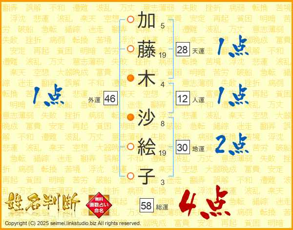 加(5画)藤(19画)木(4画) 沙(8画)絵(19画)子(3画)