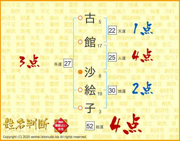 古(5画)館(17画) 沙(8画)絵(19画)子(3画)