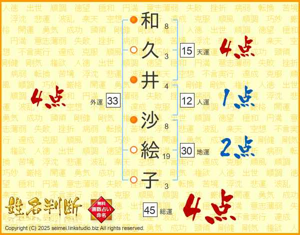和(8画)久(3画)井(4画) 沙(8画)絵(19画)子(3画)