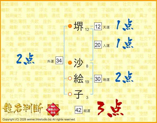 堺(12画) 沙(8画)絵(19画)子(3画)