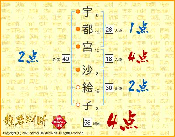 宇(6画)都(12画)宮(10画) 沙(8画)絵(19画)子(3画)