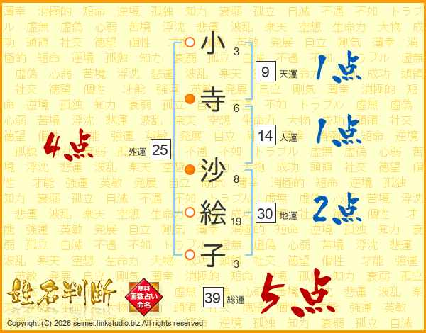 小(3画)寺(6画) 沙(8画)絵(19画)子(3画)