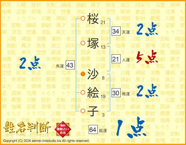 桜(21画)塚(13画) 沙(8画)絵(19画)子(3画)