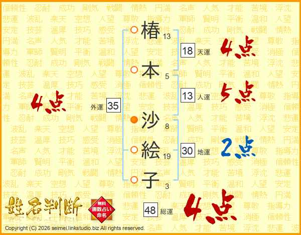椿(13画)本(5画) 沙(8画)絵(19画)子(3画)
