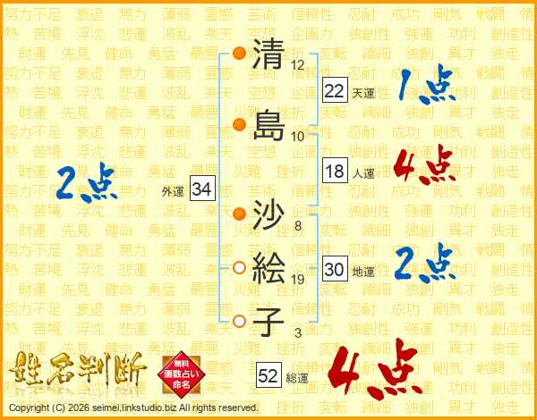 清(12画)島(10画) 沙(8画)絵(19画)子(3画)