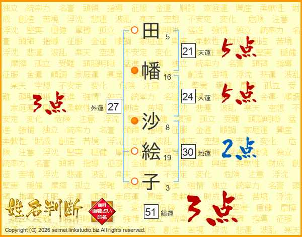 田(5画)幡(16画) 沙(8画)絵(19画)子(3画)