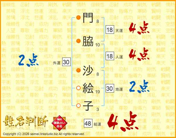 門(8画)脇(10画) 沙(8画)絵(19画)子(3画)