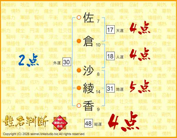 佐(7画)倉(10画) 沙(8画)綾(14画)香(9画)