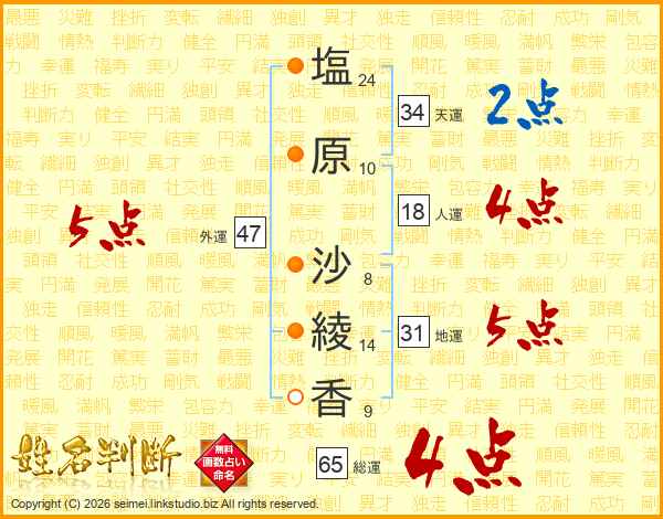 塩(24画)原(10画) 沙(8画)綾(14画)香(9画)