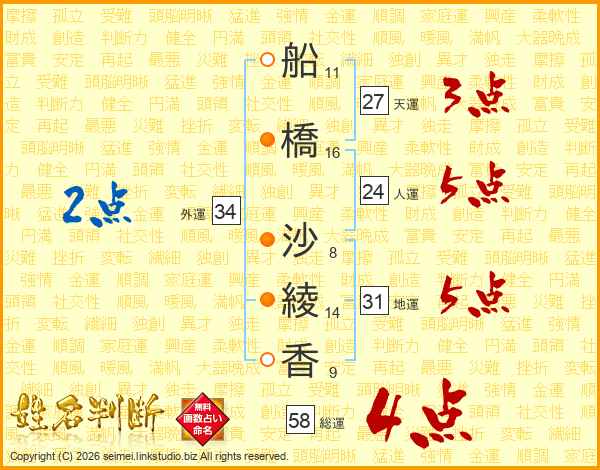 船(11画)橋(16画) 沙(8画)綾(14画)香(9画)