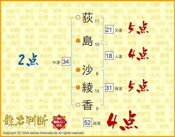 荻(11画)島(10画) 沙(8画)綾(14画)香(9画)