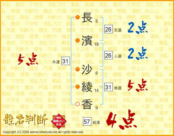 長(8画)濱(18画) 沙(8画)綾(14画)香(9画)