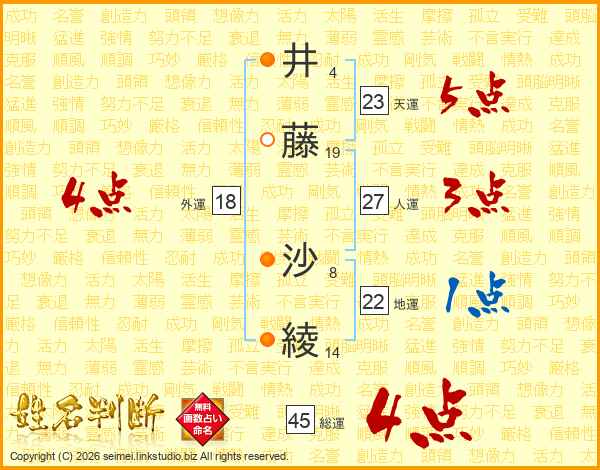 井(4画)藤(19画) 沙(8画)綾(14画)