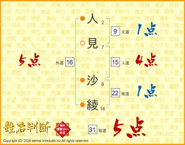 生活面を象徴する運勢です。外部から受ける影響力を表し、結婚運、家庭運や職場、環境への順応性を表します。総運から人運を引いた画数。姓や名が1文字の場合を除く。