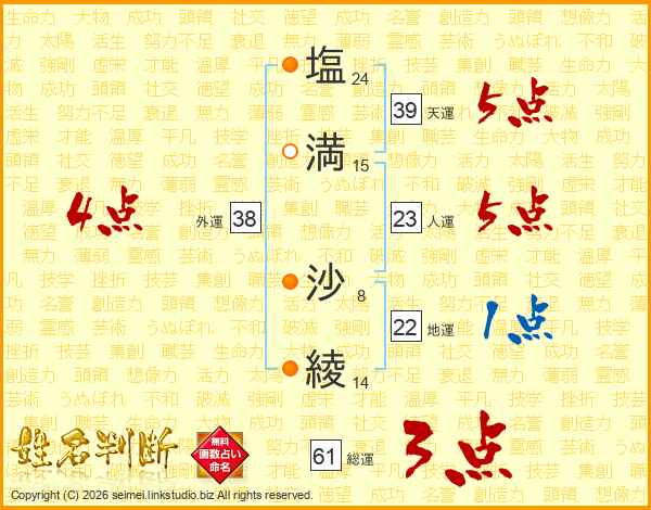 塩(24画)満(15画) 沙(8画)綾(14画)