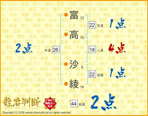 富(12画)高(10画) 沙(8画)綾(14画)