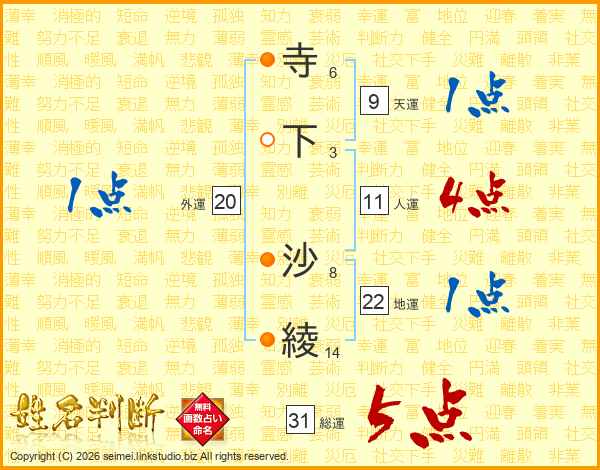 寺(6画)下(3画) 沙(8画)綾(14画)