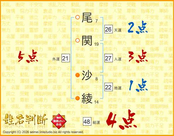 尾(7画)関(19画) 沙(8画)綾(14画)