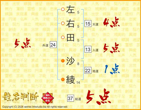 左(5画)右(5画)田(5画) 沙(8画)綾(14画)