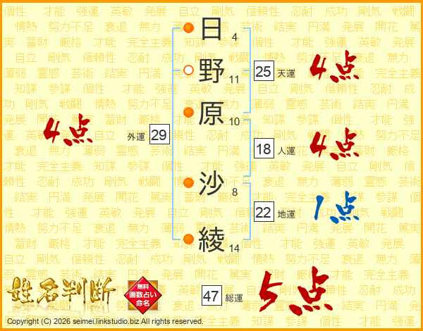 日(4画)野(11画)原(10画) 沙(8画)綾(14画)