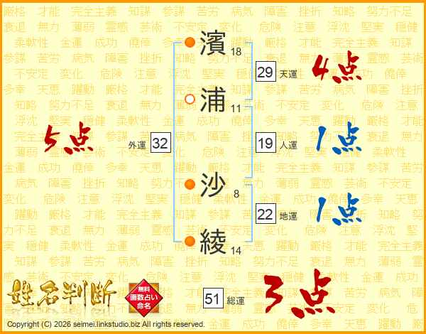 濱(18画)浦(11画) 沙(8画)綾(14画)