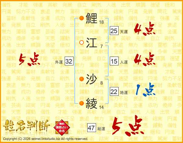 鯉(18画)江(7画) 沙(8画)綾(14画)