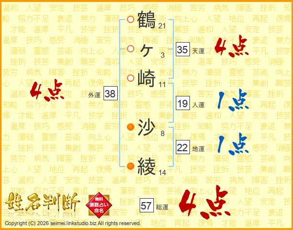 鶴ヶ崎沙綾さんの総運は57画の4点!