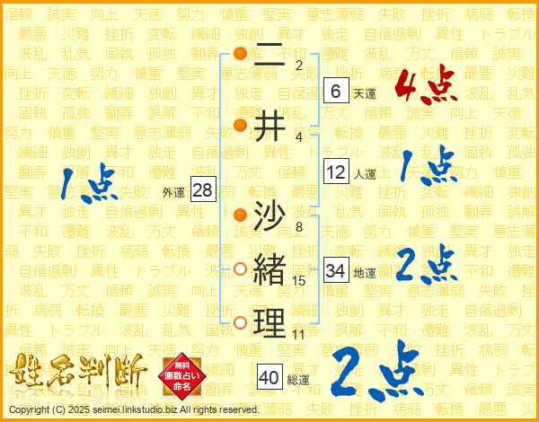 二(2画)井(4画) 沙(8画)緒(15画)理(11画)