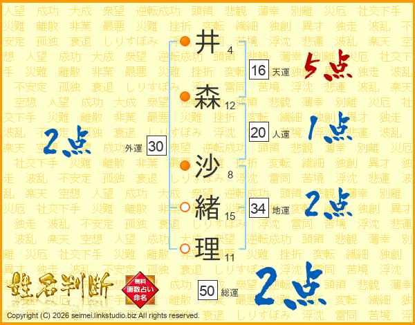 井(4画)森(12画) 沙(8画)緒(15画)理(11画)