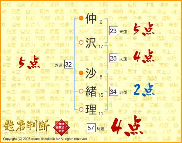 仲(6画)沢(17画) 沙(8画)緒(15画)理(11画)