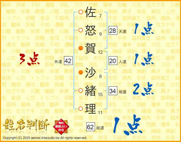 佐(7画)怒(9画)賀(12画) 沙(8画)緒(15画)理(11画)
