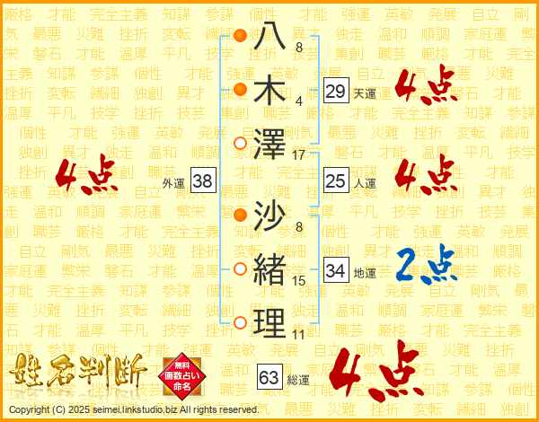 八(8画)木(4画)澤(17画) 沙(8画)緒(15画)理(11画)