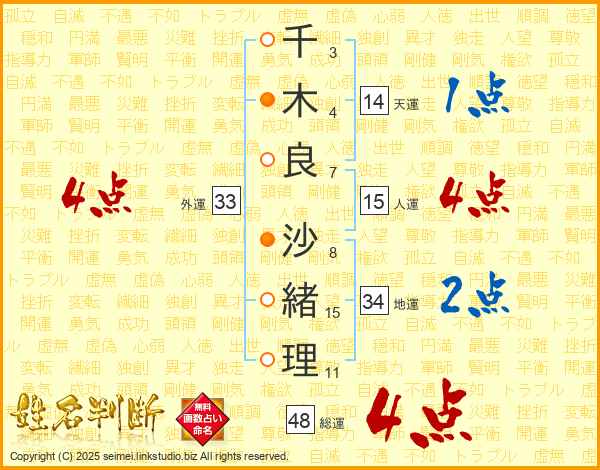 千(3画)木(4画)良(7画) 沙(8画)緒(15画)理(11画)