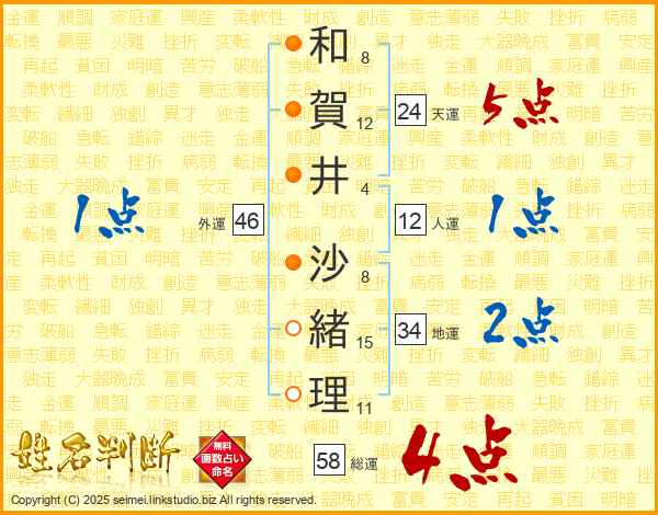 和(8画)賀(12画)井(4画) 沙(8画)緒(15画)理(11画)