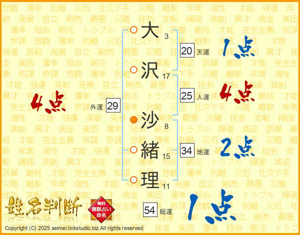 大(3画)沢(17画) 沙(8画)緒(15画)理(11画)