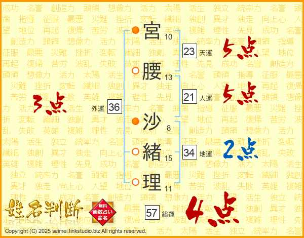 宮腰沙緒理さんの総運は57画の4点!