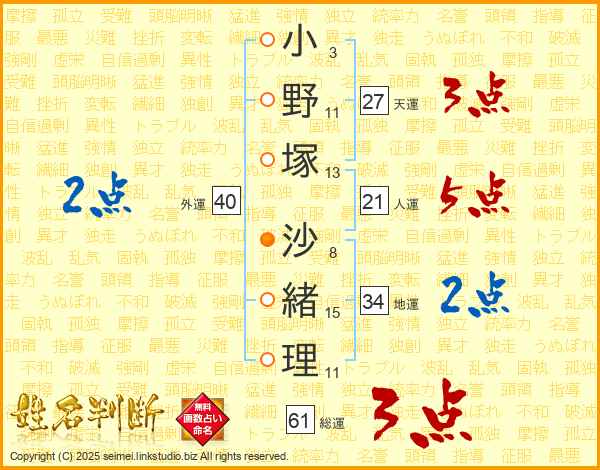 小(3画)野(11画)塚(13画) 沙(8画)緒(15画)理(11画)