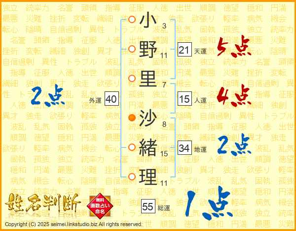 小(3画)野(11画)里(7画) 沙(8画)緒(15画)理(11画)