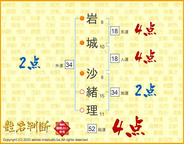 岩(8画)城(10画) 沙(8画)緒(15画)理(11画)