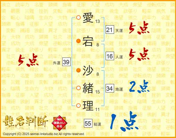 愛(13画)宕(8画) 沙(8画)緒(15画)理(11画)