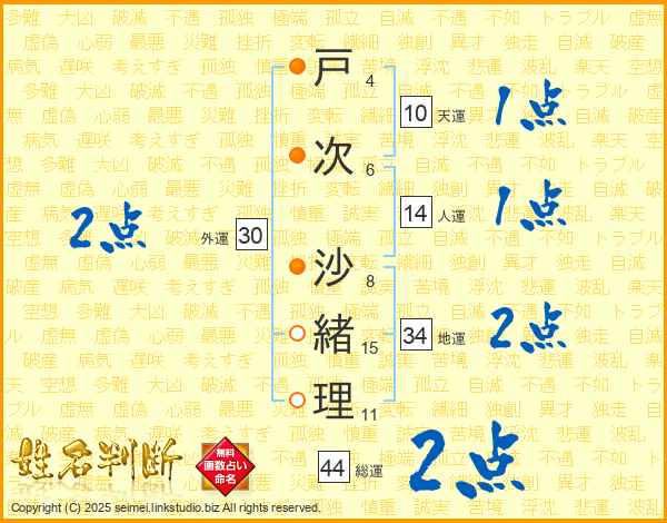 戸(4画)次(6画) 沙(8画)緒(15画)理(11画)