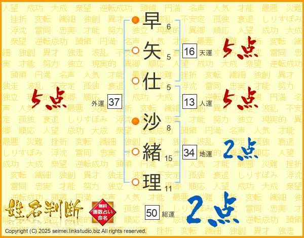 早(6画)矢(5画)仕(5画) 沙(8画)緒(15画)理(11画)