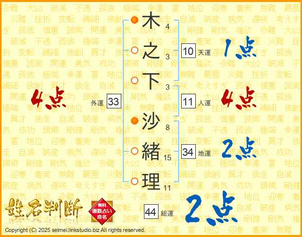 木(4画)之(3画)下(3画) 沙(8画)緒(15画)理(11画)