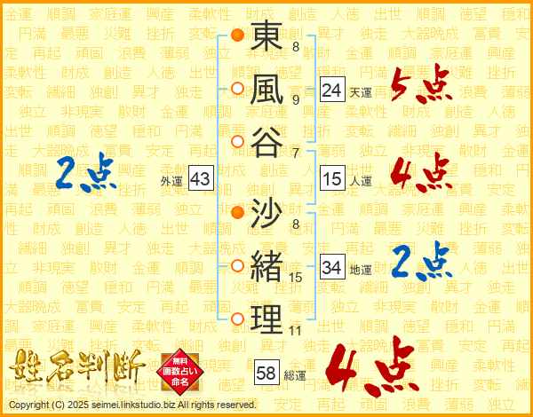 東風谷沙緒理さんの総運は58画の4点!